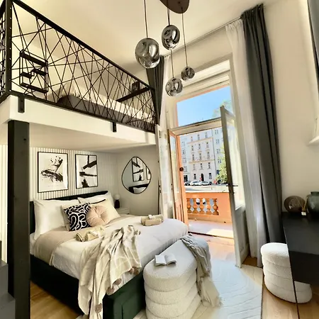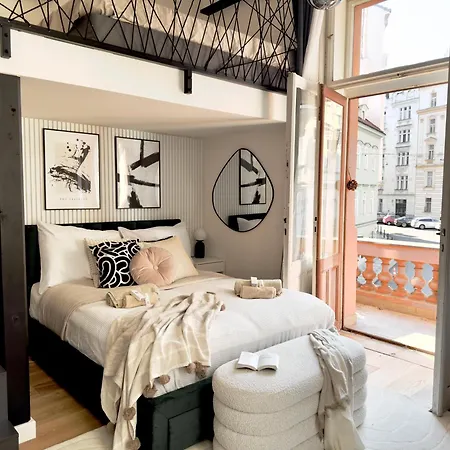 Rentero Modern High Ceiling Loft With Terrace Apartment, Prague ferielejlighed ligger næsten 1 km fra Den Spanske Synagoge. Denne indkvartering består af 1 soveværelser, 1 badeværelser og et udstyret køkken.